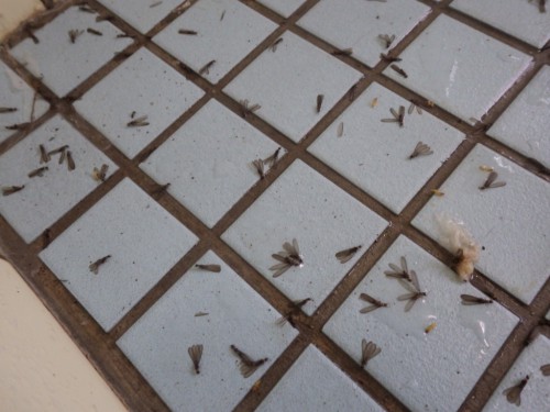 写真ではこちらです。お風呂場で出たハネアリが洗い場のタイルの上にたくさん出ています。