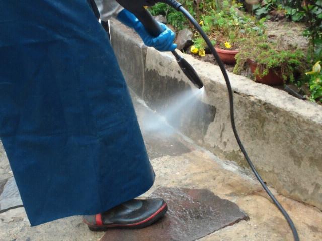 写真は玄関前のアプローチ部の高圧洗浄作業の様子です。
