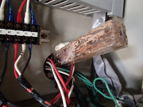 今日は先日配電盤にベイト剤を投与している遠賀郡のRCの大型物件にベイト剤投与後2回目の点検です。2週間で、3センチ×3センチ×17.5センチのベイト剤(薬剤付きの木片)を殆ど食べてしまって完食です。残ったのは外側のフィルムだけです。凄い大食漢です!