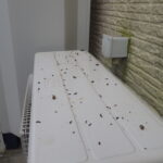 北九州市八幡東区のお客様よりコウモリ駆除のご依頼でした。駆除と言ってもコウモリは鳥獣保護法で保護動物となっていますので殺すことは出来ません。作業は追い出して侵入してこないように穴を塞ぐという内容になります。コウモリの侵入口は何処なのか?何処を伝ってきているのかを細かく見て調べていきます。クーラー周辺ですから範囲は限られてきます。