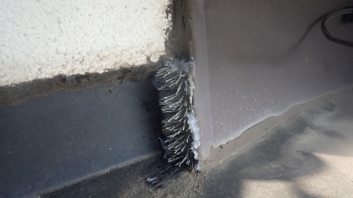 ③防鼠ブラシ(強化プラスチックとステンレスの針が一緒になったブラシ)等を使用してイタチの侵入口となる場所を封鎖していきます。