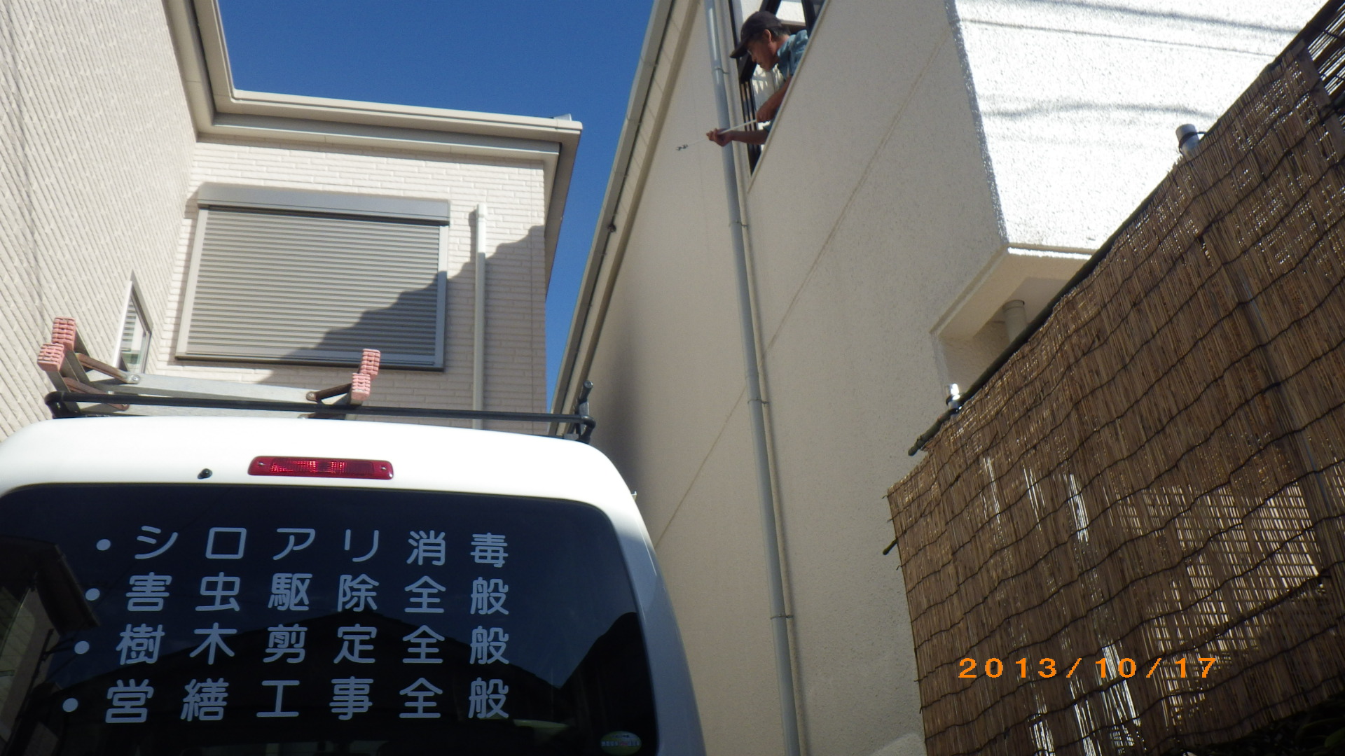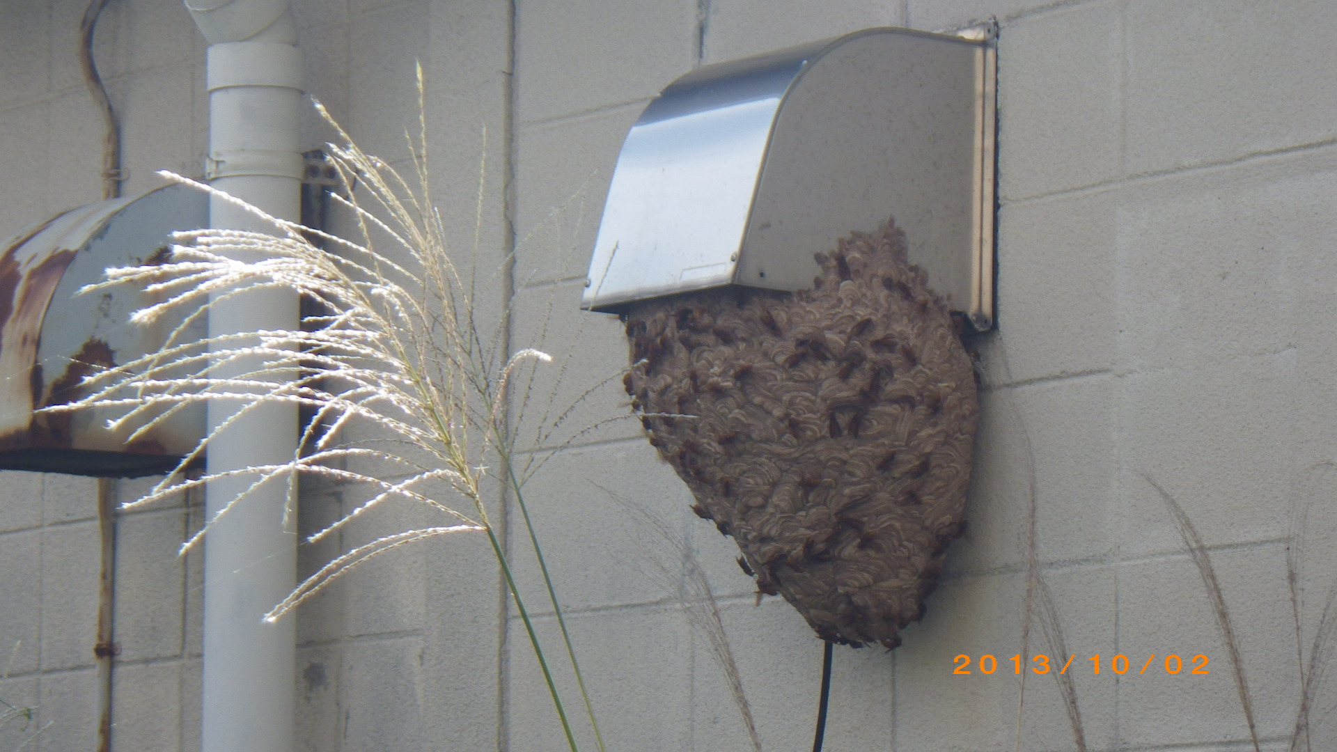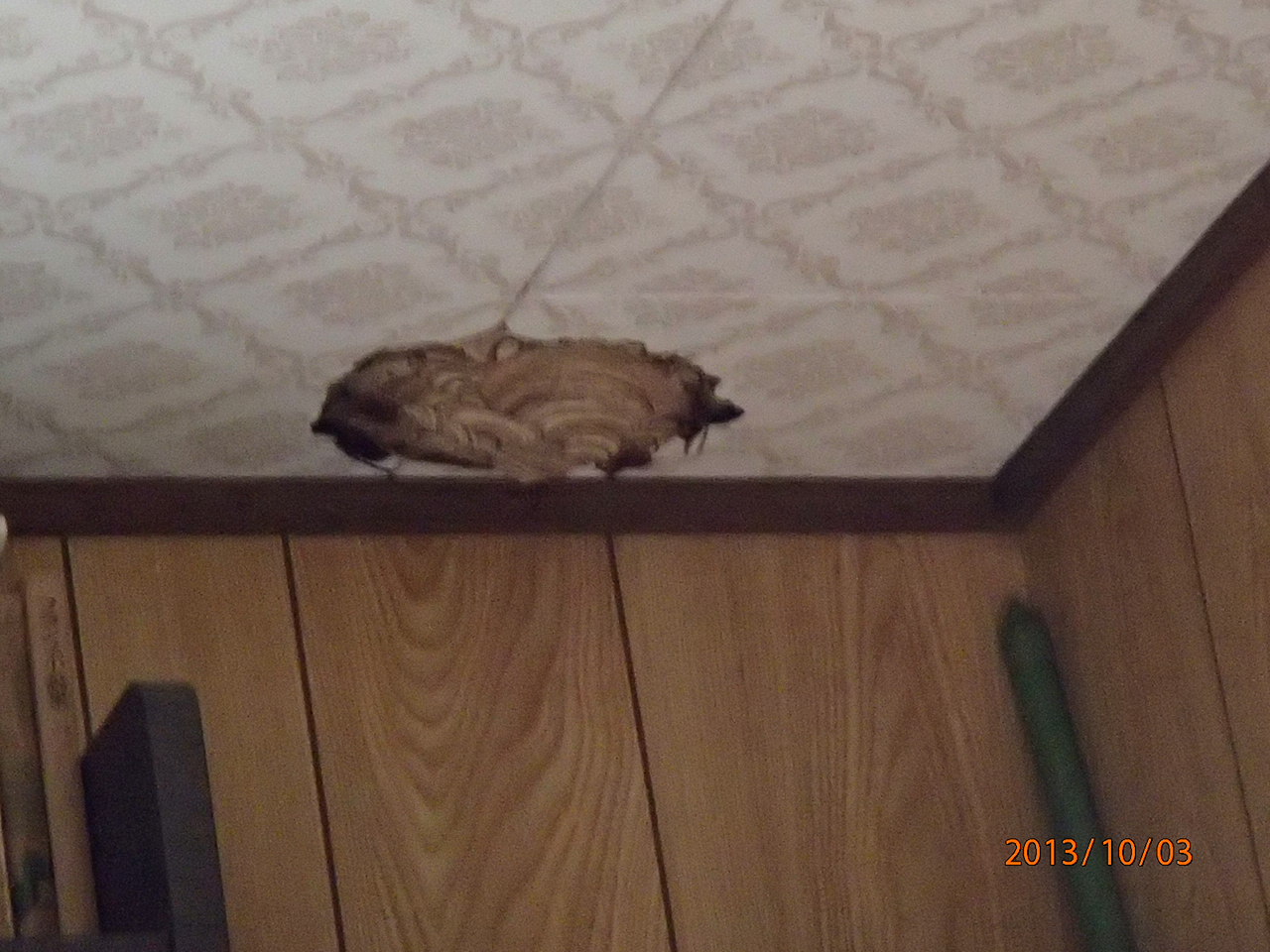 巣は二階の軒下で、かなり高所になります。幸いに2階の窓から手が届くところでしたので処置が可能でした。