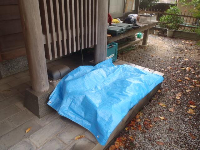 写真は青いシートの下にメダカの水槽があります。たったこれだけのことも気...