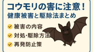 コウモリ駆除 コウモリの害に注意!健康被害と駆除法まとめ コウモリ 害に関する健康被害や家への影響、追い出し方から再発防止まで、安全な対策方法をわかりやすく解説します。 2025.05.01 コウモリ駆除