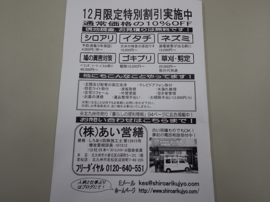 平成27年期間限定キャンペーンをさせて頂きます。12月に契約、12月に弊社で施行させて頂きましたお客様は通常施行を10%割引価格で施行させて頂きます。チラシでお声掛けも同時に行わせて頂いていますので、この期会に弊社のサービスにご興味があ...